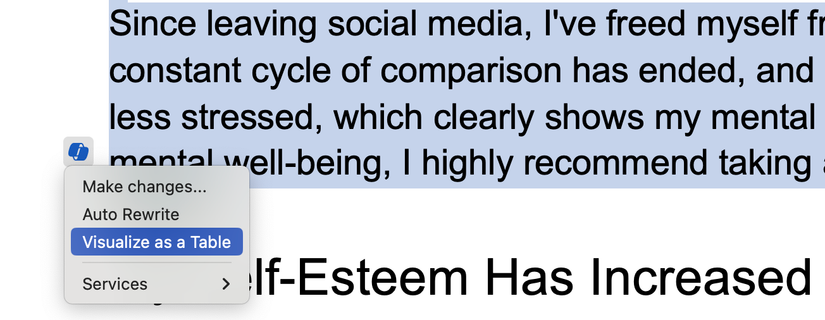Para utilizar esta función, seleccione el texto, haga clic en el icono Copilot y elija "Visualizar como una tabla" en el menú desplegable. Luego, su texto se convertirá en una tabla.