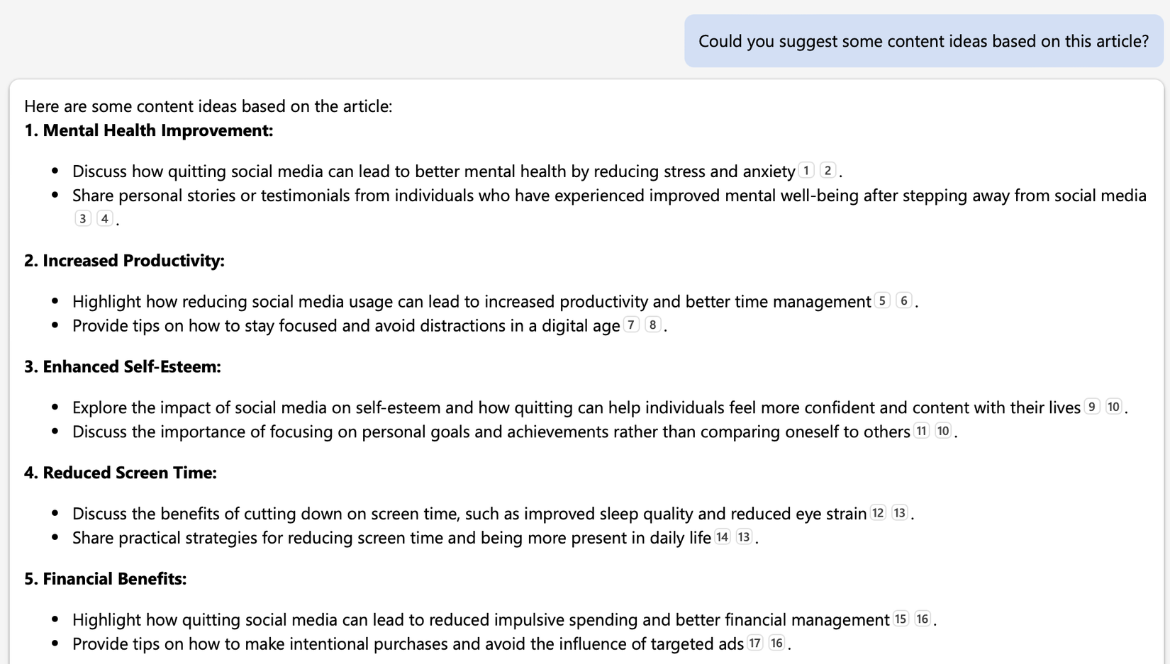 Por ejemplo, después de escribir un artículo sobre "Razones de peso para dejar de usar las redes sociales", le pedí a Copilot que generara ideas de contenido adicionales y esto es lo que se le ocurrió: