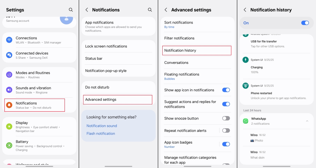 Şuraya git:Ayarlar > Bildirimler > Gelişmiş ayarlar > Bildirim geçmişiWhatsApp mesaj geçmişini 24 saat ile kontrol etmek için. Bildirim geçmişi yığınında, küçük resim yerine yalnızca WhatsApp fotoğraf bildirimini görebileceğinizi unutmayın. Fotoğrafın tamamını görmek istiyorsanız başka yöntemlerle işbirliği yapmanız gerekebilir. Olasılığı bulmaya devam edin.