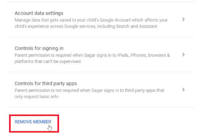“Ayarlar” menüsünde “Hesap Bilgileri” etiketli seçeneği bulun ve tıklayın. Bu, “Üyeyi Kaldır” seçeneğini bulacağınız genişletilmiş bir menü açacaktır. Buna tıklamak, seçilen Google hesabının Family Link ile bağlantısını kaldırma işlemini başlatır.